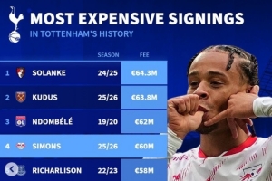 热刺最贵引援:索兰克6430万欧标王,哈维-西蒙斯6000万欧第四