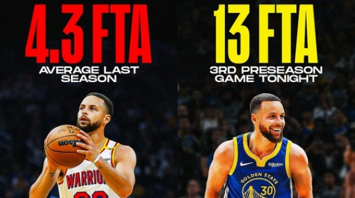 对阵开拓者的第三场季前赛中,库里获得了13次罚球机会。尽管他上赛季场均突破次数位列联盟前15,但其场均罚球数仅为4.3次。