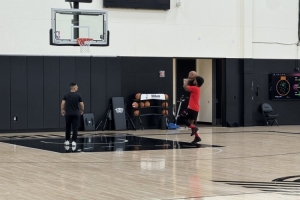体育资讯10月21日讯 开拓者随队记者Sean Highkin晒照,开拓者后卫亨德森训练后单独进行了投篮练习,杨瀚森的翻译刘禹铖(克里斯)在旁边帮他捡篮板。