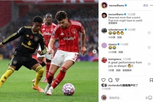 内科-威廉姆斯社媒晒出比赛照片,配文调侃曼联蓄发哥:“我们本应得到不止一分,理发还得再等等。”